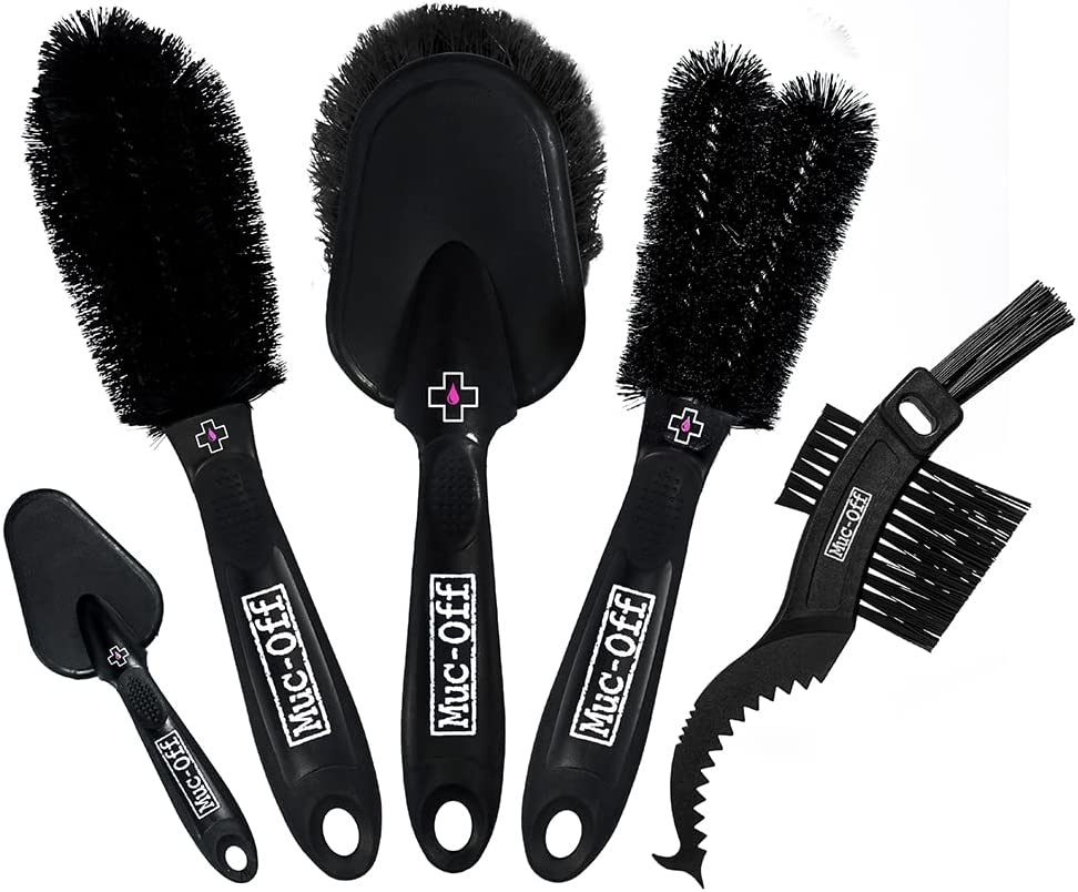 ULTIMATE CLEANING COMPANION: Muc-Off Bike Cleaning Brushes are a must-have for keeping your bike factory fresh after a round ride. FIVE OF OUR BEST: This handy kit covers all the bases, with a brush for every job. Includes our soft wash brush, detail brush, claw brush, wheel and component brush and twin tooth brush. RUBBERIZED HANDLE: Muc-Off brushes are designed with ergonomic handles for ease of use and have rubberized impact zones to prevent damage to your bike during maintenance. DURABLE BRISTLES: All of our bike cleaning brushes are made with strong nylon bristles that are designed to endure thorough cleaning. SUITABLE FOR ALL BIKE TYPES: Whether you prefer to hit the road or shred the trails on your mountain bike, Muc-Off cleaning brushes are essential for your after-ride cleanup.